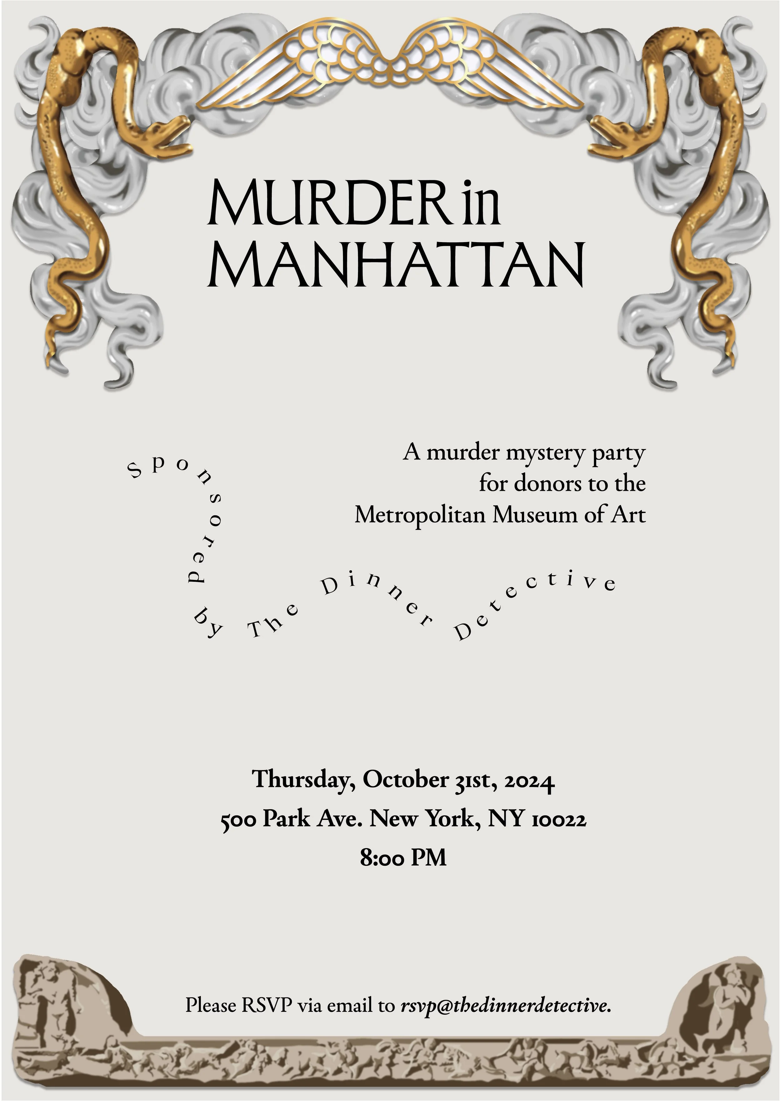 This design project is an immersive invitation suite for a murder mystery dinner party held at The Met, themed around the myth of Medusa. Drawing from classical motifs and artworks housed in the museum, the invitation experience blends narrative, symbolism, and tactile design. Donors receive a custom box inspired by Roman sarcophagi, adorned with hand-illustrated Medusa motifs. Inside, a letter opener modeled after Perseus’ sword—referencing the famed statue at The Met—is used to slit open an envelope bearing Medusa’s head, symbolically reenacting her beheading. The set also includes a personalized name tag and, as a final touch, a keepsake pocket mirror featuring custom illustrations—an homage to the mirrored shield Perseus used to defeat Medusa.